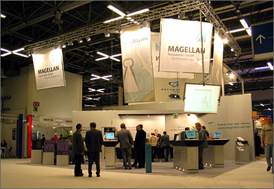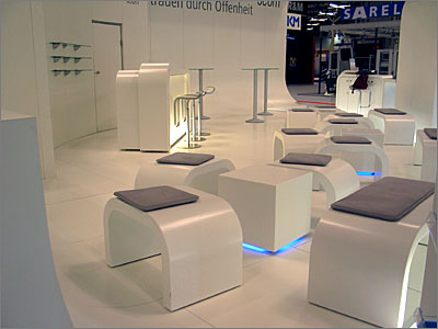 Besonders gut gefällt mir auch der als Chillout Lounge konzipierte Stand von 3COM. Ganz in perlmutt-weiss gestaltet, angestrahlt von farbigen Varylights, überall runde Ecken. Groovy!