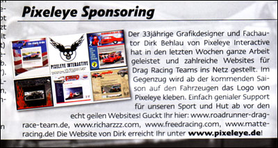 Ich werde in Zukunft eines der schnellsten Motorräder der Welt sponsern ;-) Das King Racing Team aus England. Neben dem mitlerweile obligatorischen Deal Pixeleye Logo auf dem Dragbike gegen Website wird es dieses Mal auch zusätzlich, weltweite TV-Präsenz geben...:)