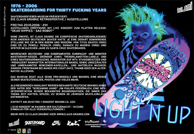 Ohne Zweifel ist Claus Grabke die europäische Skateboardlegende! Kein anderer deutscher Skater hatte je eine derart dominirende Stellung wie er in den 80ern und 90igern. Mehrfacher Deutscher- und Europameister, Europacup- und Monster Mastership-Sieger. Gründer eines Trendklamotten-labels und eines Skateboardmagazins. Moderator auf MTV. Studiobesitzer und -produzent namhafter internationaler Bands, sowie ungezählter und unbekannter Newcomer-Kapellen...und natürlich Musiker, Sänger, Frontmann bei Bands wie Eight Dayz, Thumb oder den Alternative Allstars.