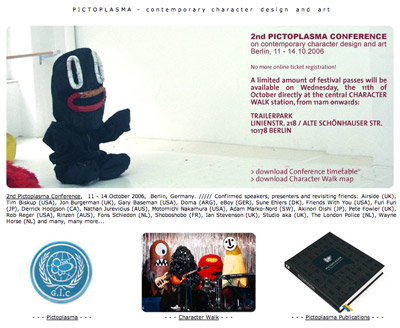 2nd Pictoplasma Conference, 11 - 14 October 2006, Berlin, Germany. ///// Confirmed speakers, presenters and revisiting friends: Airside (UK), Tim Biskup (USA), Jon Burgerman (UK), Gary Baseman (USA), Doma (ARG), eBoy (GER), Sune Ehlers (DK), Friends With You (USA), Furi Furi (JP), Derrick Hodgson (CA), Nathan Jurevicius (AUS), Motomichi Nakamura (USA), Adam Marko-Nord (SW), Akinori Oishi (JP), Pete Fowler (UK), Rob Reger (USA), Rinzen (AUS), Fons Schiedon (NL), Shoboshobo (FR), Ian Stevenson (UK), Studio aka (UK), The London Police (NL), Wayne Horse (NL) and many, many more...
