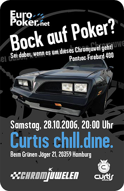 Das Finale findet statt im Curtis, Beim Grünen Jäger 21 / Stresemannstraße 1-3, Hamburg. Willkommen ist ab 20.00 Uhr nicht nur jeder aus der Chromjuwelen-Familie, sondern alle Rock'n Roller, Burt-Reynolds-Fans und Poker-Süchtigen. Und als ob das nicht genug wäre: