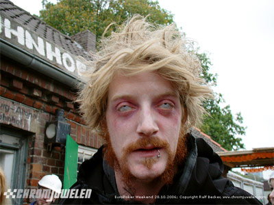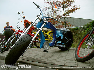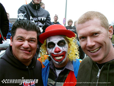 Nach dem üblichen gequatsche ging es weiter im Hafen zum Platz des Motoclub, dort veranstalteten die Elbcoastcylces einen Halloweenrun. Naja da Burnout mit dem Fahrrad nicht funzt und man irgendwie ja Gummi auf den Teer ritzen will macht man halt nen Bremswettbewerb.....Da haben wir dann auch Helge von den Motoravern getroffen.