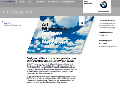 Bei BMW pflegt man den regelmäßigen Kontakt zur Kunst- und Designszene. Bei Art-Windschott steht der Designnachwuchs im Fokus: Kunst- und Designstudenten aller deutschen Hochschulen können an diesem Designwettbewerb teilnehmen, indem sie bis zum 31.08.2006 ihren Gestaltungsvorschlag für das Windschott des neuen BMW 3er Cabrios einreichen.