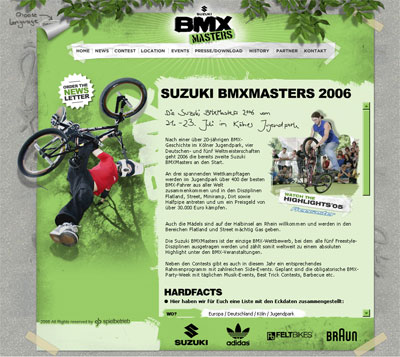 Leichte Navigationen und bessere Übersichtlichkeit sind nur zwei Beigaben um die neue Homepage zu beschreiben. Das Wichtigste ist natürlich der Inhalt, und so sind unter www.bmxmasters.com sämtliche Infos zur Suzuki BMXMasters 2006 zu finden: Angefangen von den Anfahrtswegen und Übernachtungsmöglichkeiten über News zu den Fahrern oder Infos zu Disziplinen bis hin zu den Highlights aus dem letzten Jahr. Unter der Newsletter-Funktion kann man sich regelmäßig mit den neuesten Infos zum Event des Jahres versorgen lassen.