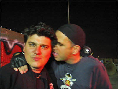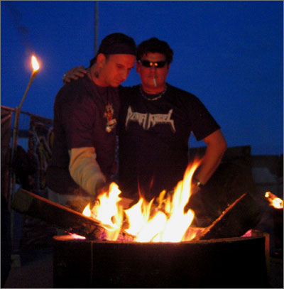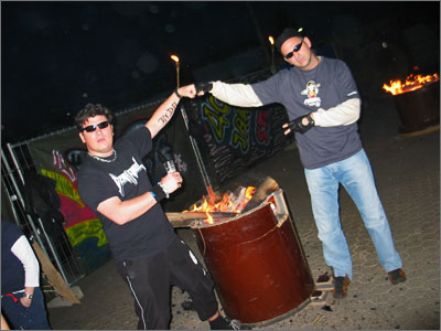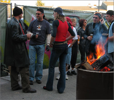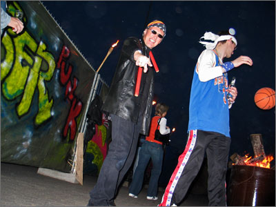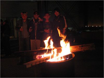 Stilecht auf einem abgelegenen Baustellengelände mit brennenden Tonnen (die im Laufe des Abends auseinanderplatzten), old-school Breakdance Mucke, Chakkos, Basketball Gepose und Beamerwand mit Breakdance Videos.