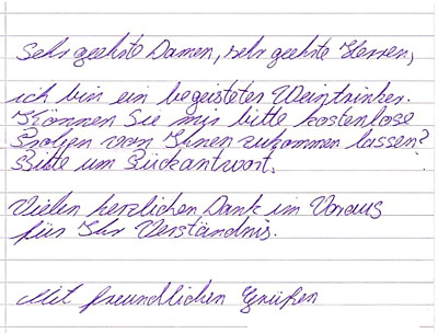 Sowas bekommt ein befreundeter Weinhändler regelmäßig ins Haus. Obwohl: Bei mir trudeln auch regelmäßig Anfragen aus China, Indien und Co. ein. Ob ich Ihnen nicht freundlicherweise die Photoshop PSD Datei schicken könnte für die eigene Website. Am besten auf CD ;) Ich mach etwas falsch...