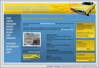 Brandenburg Raceway, die Site zur neuen Rennstrecke! Die Eröffnung am 23.4. wird der Hammer, werden doch z.B. ein Raketenwagen, Burnout-Nightshow und diverse andere nette Sachen "passieren". 8-)