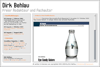Eine kleine Site für meine journalistischen Tätigkeiten...ich will den Bereich dieses Jahr ausbauen und brauche eine MicroSite, die sich nur damit beschäftigt bzw. meine Artikel und Interviews präsentiert. Zu finden unter http://www.dirk-behlau.de
