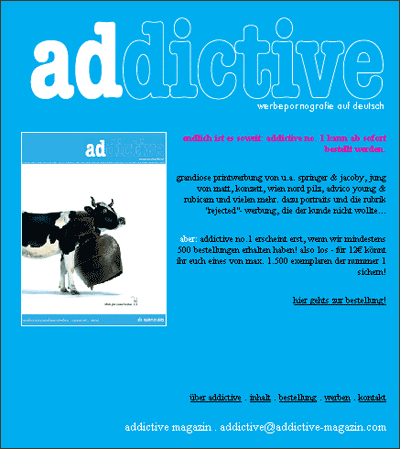 addictive richtet sich an alle werber und designer, die nicht nur kreative arbeit selbst produzieren, sondern auch von kreativer arbeit anderer inspiriert, ja sogar stimuliert werden. deshalb wagen wir auch zu sagen: addictive - das pornoheft für werber.