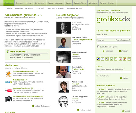 grafiker.de ist eine dynamische, stetig wachsende Gemeinschaft von Kreativen. Auf der Webseite finden die User aktuelle News z.B. aus den Bereichen Webtrends, IT und Design sowie zahlreiche Tipps und Downloads, die Kreativen den Arbeitsalltag erleichtern und Denkanstöße bieten sollen. Auch ein Forum ist auf der Seite vertreten.