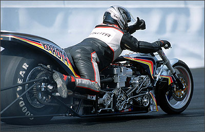 Nicht weniger Respekt einflössend sind die Leistungen der "Zweiräder": Mit über 1000 PS Leistung katapultieren die Nitro-Bikes ihre Piloten in knapp einer Sekunde von 0 auf 100 Kilometer pro Stunde. Der Sprint über die Viertelmeile dauert nur 6,5 Sekunden, dann erreichen die kompressorgeladenen Motorräder Spitzengeschwindigkeiten von über 300 Stundenkilometern.