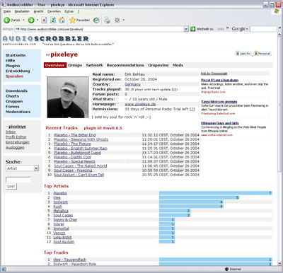 audioscrobbler.com angemeldet ;-) Wenn ich in iTunes MP3s abspiele, wird die Playlist ins Web (per Plugin, das man für diverse Player wie Winamp, iTunes etc. kostenlos auf der audioscrobbler website runterladen kann) übertragen. Dann kann ich sehen, wer noch so nen Käse wie ich hört ;-) Wofür das gut sein soll, weiss ich zwar nicht genau, aber Spass machts trotzdem. Und Mitglied in der