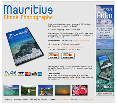 Inhalt: 50 hochauflösende Fotos (3072 x 2048 Pixel) von der Trauminsel Mauritius. Bezahlen kann man entweder mit Paypal oder in Deutschland per Überweisung.
