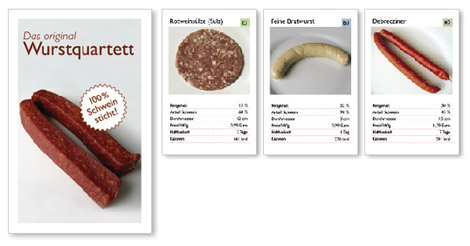 Normalerweise liegen Würste auf dem Teller, doch ab jetzt sorgen sie für Spielvergnügen im Wurstquartett-Kartenspiel. Jede der 32 Karten zeigt eine leckere Wurst.
