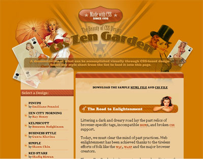 Das Online-Projekt „Zen-Garten“ ist zu gleichen Teilen Manifest und Galerie und wurde angelegt, um zu veranschaulichen, was sich optisch durch CSS-Design erreichen lässt. Designer können ihre eigenen Visionen in Form von Stylesheets und Bildern einreichen. Der Haken besteht darin, dass alle Designs dieselbe grundlegende HTML-Datei nutzen müssen. Es gibt keine Ausnahmen; der HTML-Code ist für alle Designs absolut identisch.